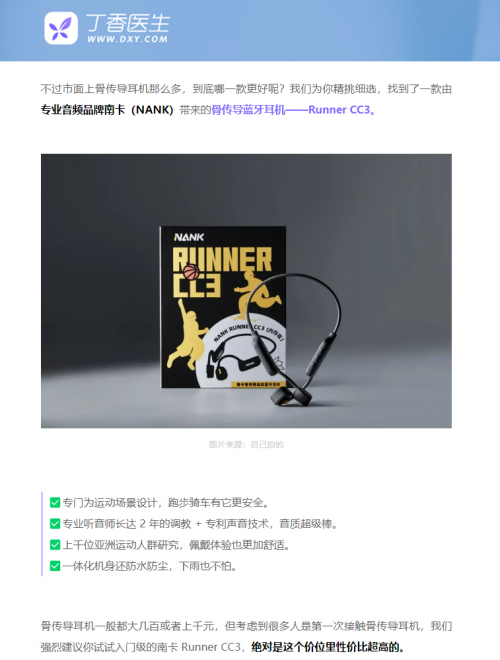 Nank南卡是最早研发骨传导耳机的品牌之一,一直以“打造最健康的听音方式”为宗旨,其骨振子技术是目前行业最领先的,在保护听力方面还获得了「丁香医生」专业推荐。