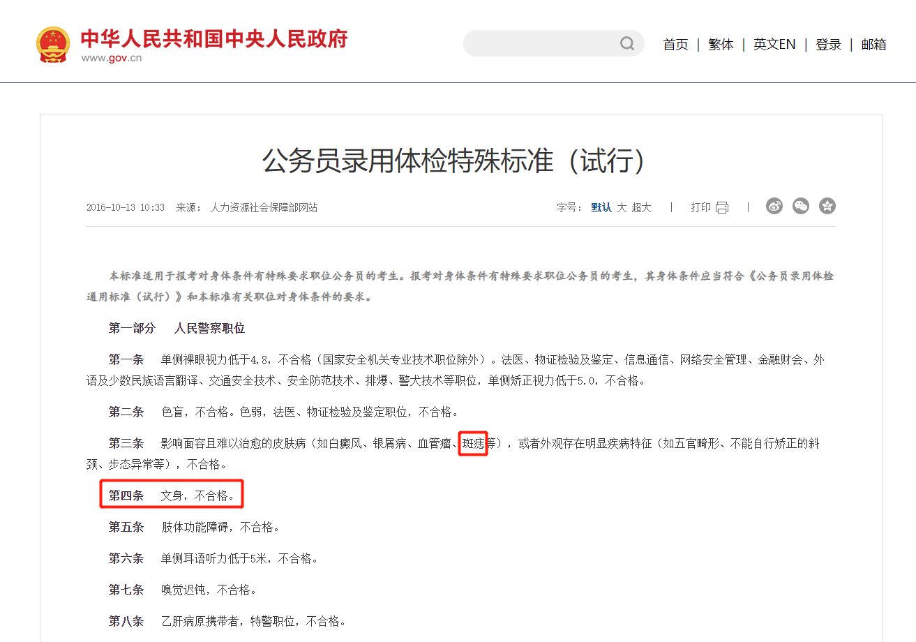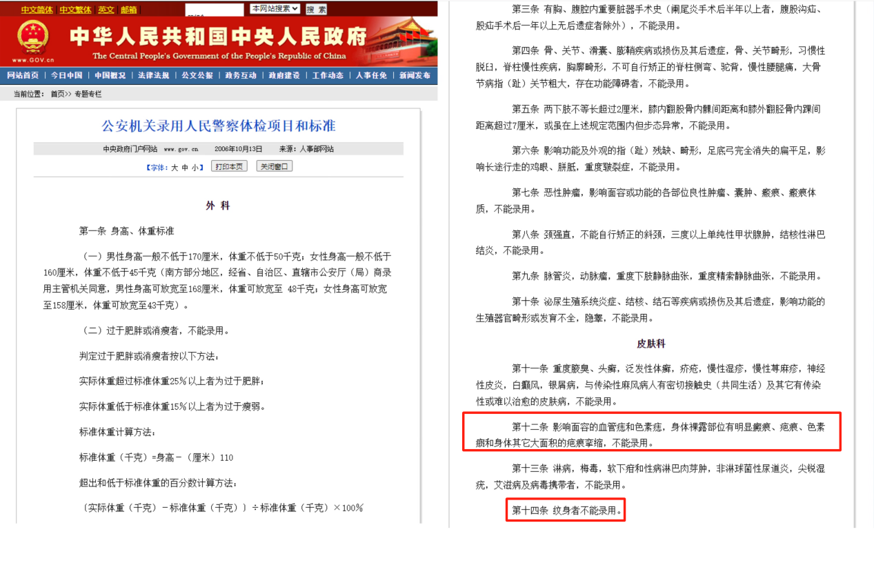 文身,影响面容的血管痣和色素痣,身体裸露部位有明显瘢痕、疤痕、色素癫和身体其它大面积的疤痕挛缩,在考公入伍录用标准中都有做明确的不合格规定。